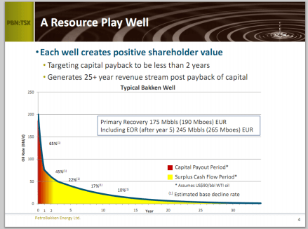 (4) The business model, about which Wright speaks, makes sense to me. It is true that initial funds up front for drilling result in debt at the beginning (Petrobakken is still a young company), and it is true that the production rate drop off is rapid in the first few months, but it is also true that the net-back (profit after expenses) for each well is very high and that the first few months of production pay for all the drilling expenses; then the wells continue to produce at a low rate for many years, providing a continuous flow of cash as a return on investment.