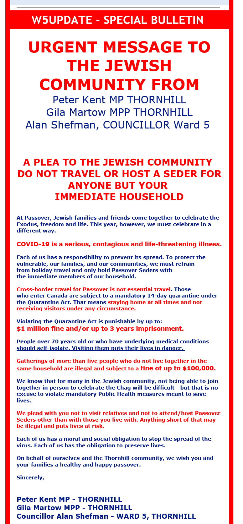 This memo was sent out to Jews in my area and it implies that a $1,000,000 and 3 years in jail could result from having more than five people at their house at Passover. A similar message was sent to Christians before the Easter holiday: